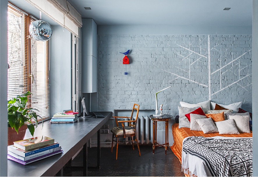 Изголовье в виде полок от пола до потолка или мягкая каретная стяжка на всю стену из замши, бархата или кожи – отличная идея для комнат любого размера. Полки добавят функционально-полезного пространства, а мягкая объемная стяжка – уюта.