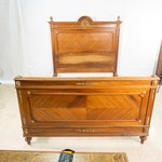 Антикварная кровать авторства французских мастеров выполнена из ореха богатого медово-охристого оттенка с великолепной природной текстурой, продемонстрированной гладкими плоскотями. По стилистической принадлежности кровать тяготеет к эстетике неоклассицизма. Неоклассицизм возник как реакция на частую смену стилей XIX века, что напрямую отражалось на мебельном убранстве. Желание найти опору в стремительно меняющемся мире, эстетизация прошлого привели к возвращению к классическим пропорциям, симметричным композициям, использованию античных элементов декора. Французские краснодеревцы по-своему осмысляли стилевые веяния. Осваивая классицистические формы, они оперировали привычными для них материалами и техническими приемами, получая в результате утонченное и стилистически законченное произведение. Кровать из коллекции Alter Ego Home отличается архитектонически выверенной конструкцией предмета. Кровать решена в виде массивных глухих филенчатых поликов прямоугольной формы. Изголовье дополнено выступающим полуциркульным навершием со вписанной в него накладной композицией в виде лаврового венка. Поверхности поликов облицованы ритмичным паркетри, блестяще обыгрывающим фактуру дерева. Кровать датирована 1870-ми гг.
