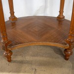 Тумба овальной формы покоится на четырех балясинообразных ножках с перехватами, соединенных фигурной проножкой-полккой. Основной объем тумбы имеет распашную слегка изогнутую под форму предмета дверцу, украшенную фигурной рамой из разного накладного профиля с акантовыми листами, в центре которой расположена цветочная гирлянда. Внутри предмет имеет керамическую отделку. В верху у тумбы находится небольшой выдвижной ящик. Столешница выполнена из красного мрамора Incarnat turquin с включениями, прожилками и пятнами неправильной формы серого и белого кальцита. Тумбу украшает великолепный набор в технике паркетри, который подчеркивает рисунок древесины. Тумба датирована 1860-ми гг.