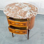 В нашем салоне старинной мебели вы можете купить антикварную прикроватную тумбу авторства шведских мастеров, выполненную из махагони охристого оттенка и дополненную столешницей из мрамора. По стилистической принадлежности тумба тяготеет к эстетике неоклассицизма. Неоклассицизм возник как реакция на частую смену стилей XIX века, что напрямую отражалось на мебельном убранстве. Желание найти опору в стремительно меняющемся мире, эстетизация прошлого привели к возвращению к классическим пропорциям, симметричным композициям, использованию античных элементов декора. Шведские мастера по-своему осмысляли стилевые веяния. Осваивая классицистические формы, шведские столяры оперировали привычными для них материалами и техническими приемами. Овальная в сечении тумба оснащена двумя выдвижными ящичками, украшенными интарсией растительного характера. Ящички дополнены ключевинами фигурной формы. Скошенные боковины подчеркивают вертикальное строение предмета, а накладки со стилизованными львиными маскаронами придают тумбе нарядный вид. Тумба покоиться на высоких ножках с накладными каблучками. Линия царги в форме арбалета украшена металлической накладкой флорального орнамента. Тумба дополнена столешницей красного мрамора Incarnat turquin с многочисленными включениями фрагментов ископаемых морских организмов, прожилками и пятнами неправильной формы серого и белого кальцита. Предмет антикварной мебели датирован 1930-ми гг.