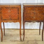 В нашем салоне старинной мебели вы можете купить антикварную прикроватную тумбу авторства итальянских мастеров, выполненную в стилистике Наполеона III с великолепной облицовкой из ореха разных оттенков. Тумба создана на пороге эпохи дизайна в стиле модерн, сочетание королевской экстравагантности и круглой фурнитуры делают подобные изделия особенно великолепными и органичными. Тумба в основном объеме оснащена четырьмя выдвижными ящиками и изящной дополнительной столешницей, утопающей в подстолье. Скошенные боковины декорированы бронзовыми накладками фигурной формы в виде рокаиля и цветочного убранства.
