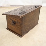 Удивительная в художественном отношении шкатулка выполнена английскими мастерами из дубового массива насыщенного чайного оттенка с градиентом. Шкатулка поражает высоким уровнем мастерства изготовления и обилием резного растительного орнамента, покрывающего поверхности. Скошенная откидная крышка и лицевая стенка в центральной части украшены излюбленным английскими мастерами мотивом акантового и дубового листа. Резная стилизация трельяжной сетки подчеркивает фактуру дубового массива. Металлические петли придают предмету атмосферность и художественную завершенность. Шкатулка датирована 1870-ми гг.