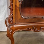 В нашем салоне старинной мебели вы можете купить антикварную витрину авторства нидерландских мастеров, выполненную из махагони насыщенного каштанового оттенка. Гладкие плоскости шкафа удачно контрастирует с ажурной резьбой, подчеркивающей богатство текстуры махагони. По стилистической принадлежности витрина тяготеет к эстетике неорококо, что проявилось в мягких округлых формах, легкости пропорций и игривом атектонизме деталей. Витрина оснащена распашной застекленной дверцей, скрывающей внутренний объем симметрично разделенный полочками. Главной акцентной деталью предмета является обильная массивная сквозная резьба из рокайльных завитков и акантовых листьев, создающая эффектное навершие и обрамляющая контур стеклянной вставки. Витрина рассчитана на демонстрацию достатка хозяина дома в виде коллекций фарфора, стекла, металла и прочих репрезентативных предметов. Предмет датирован 1850-ми гг.