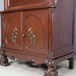 В нашем салоне старинной мебели вы можете купить антикварную витрину авторства французских мастеров, выполненную из красного дерева богатого каштанового оттенка. По стилистической принадлежности витрина тяготеет к эстетике модерна, утвердившегося с конца XIX столетия. Это время в мебельном искусстве интересно яркими местными национальными школами. Франция являлась очагом нового движения в области прикладного искусства. Предметы начинают основным тенденциям в мебельном формообразовании начала столетия: утилитарная конструкция, минимум декора, при его наличии - полное подчинение конструктивному решению. Орнаментальное, эстетическое начало, согласно бельгийскому художнику и выразителю новых тенденций в искусстве Ван де Велде, должно быть заложено в самой форме предмета. Роскошная витрина трактована двухъярусным объемом. Верхний объем легка утоплен в отношении нижнего и оснащен двумя распашными дверцами в форме арбалета в верхней части. Стекло на дверцах дополнено деревянными профилями, делящими его на мелкие ячейки. За откидной панелью скрывается внутренний объем с делением на мелкие полочки и выдвижные ящички искусной работы. Задняя стенка витрины оснащена рядом симметричных отверстий, способствующих циркуляции воздуха в случае, если витрина будет служить для хранения и демонстрации книг ее владельца. Массивный антаблемент с фигурным карнизом увенчивается двумя боковыми картушами, придающими предмету праздничный и слегка вычурный вид. Нижний объем полый, скрыт на двумя распашными дверцами. Массивные устойчивые ножки представлены в виде резных растительных композиций. Безусловным акцентом предмета служат полихромные металлические накладки в виде стилизованных цветочных композиций. Витрина является оригинальным образцом аутентичного творчества французских краснодеревцев и способная стать жемчужиной коллекции любителя антиквариата. Антикварная витрина из коллекции старинной мебели Alter Ego Home датирована 1890-ми гг.