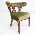 Антикварное кресло изготовлено голландскими мастерами из массива дума с красивым природным рисунком, обтянуто зеленой бархатистой тканью с золотистым позументом и декорирован художественной резьбой. По своему стилистическому направлению предмет тяготеет к эстетике бидермейера. Его скругленная спинка с обнимающим валиком тронутым каретной стяжкой представлена резными деталями с мотивами аканта, волютного завитка и чешуйчатого орнамента. Передние ножки в форме каннелированных балясин поставлены на колесики. Задние ножки книзу отогнуты, что придает конструкции устойчивость. Кресло снабжено мягким сидением с деликатным изгибом. Предмет отличается высокой эргономичностью.