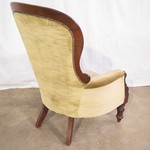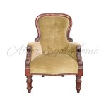 Кресло имеет низкую посадку, фигурную спинку капитоне, мягкое сидение и локотники, точеные ножки и резные элементы подлокотников. Обивка бархатистой тканью нежного оливкового оттенка эффектно подчеркивает цвет древесины предмета. Кресло отличается самобытным характером и крайней оригинальностью. Кресло датировано 1880-ми гг.