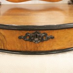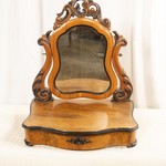 В нашем салоне старинной мебели вы можете купить антикварное настольное зеркало авторства нидерландских мастеров, выполненное из ореха насыщенного янтарного оттенка с великолепным природным градиентом. По своему стилистическому направлению настольное зеркало тяготеет к эстетике неорококо, что проявилось в использовании популярного рокайльного мотива в виде рокайльей и акантовых завитков. Зеркало отличается высоким мастерством исполнения. Оно трактовано фигурной зеркальной рамой - псише с округленным завершением, в качестве боковых устоев выступают ритмичные акантовые завитки, отполированные до блеска и опирающиеся на фигурное основание. Роскошная резная композиция украшает навершие предмета. Тектоника предмета подчеркнута профилями контрастного оттенка. Настольное зеркало датировано 1850-ми гг.