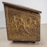 Антикварное декоративное ведро изготовлено из массива дерева и облицовано золотистыми латунными листами с художественной чеканкой. Ведро выполнено в форме небольшого сундучка с откидной крышкой, оснащено четырьмя миниатюрными колесиками и съёмной внутренней вставкой с двумя ручками. Предмет украшен сюжетным рельефом с четырех сторон. На каждой панели занимательная жанровая сценка в духе "малых голландцев" с их народным юмором и вниманием к деталям. Картина на створке крышки изображает сценку у таверны: на фоне кирпичной стены танцует пара в окружении музыкантов и других постояльцев.