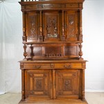 В нашем салоне старинной мебели вы можете купить антикварный буфет авторства французских мастеров, выполненный из дубового массива коньячного оттенка c выраженным фактурным узором. По своему стилистическому направлению антикварный буфет относится к стилистике неоренессанса, что проявилось в архитектоничной форме и декоре предмета. Стиль неоренессанс появился на рубеже XIX-XX столетий, в рамках стилевого эклектизма. Именно в этот период, во многом благодаря романтической литературе - произведениям П. Мериме, А.Дюма, В. Скотта и др. - возникает повсеместное увлечение эпохой Возрождения. Гуманистическое мировоззрение, торжество земного бытия - типичные черты эпохи Ренессанса, которые вдохновляли мастеров XIX столетия. Человек, признанный венцом творения, становится главным сюжетом литературы, живописи, зачастую его фигура размещается на предметах мебели. Антикварный буфет из коллекции Alter Ego Home выполнен в спокойных уравновешенных пропорциях в рамках строго линейной композиции. Французские мастера талантливо обыграли цвет и текстуру дуба. Конструктивно буфет предельно архитектоничен и трактован двухъярусным фасадом. Верхний ярус оснащен тремя распашными дверцами, фланкированными изящными точеными колоннами с перехватом. В фасад дверец вписаны барельефные композиции в виде мужских фигур - в центральной части и растительных композиций - на боковых. Широкий профилированный фриз служит основанием для фигурного карниза с балясинообразной балюстрадой и выступающей центральной частью. Верхний ярус приподнят над столешницей на высоту боковых устоев, трактованных в виде точеных балясин. Нижний ярус представлен массивной двухдверной тумбой с парой выдвижных ящиков. Филенки дверок украшены акцентными рельефными композициями растительного орнамента. Фасады выдвижных ящиков дополнены навесными металлическими ручками. Атмосферный буфет из коллекции старинной мебели Alter Ego Home датирован 1860-ми гг.