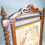 Антикварный каминный экран авторства французских мастеров выполнен из махагони богатого охристого оттенка и затянут тканевой вставкой. По стилистической принадлежности каминный экран эклектичен и сочетает прямоугольную классицистическую форму с элементами готики и барокко. Прямоугольная рама экрана украшена устоями в виде витых «Соломоновых» колонн и покоится на расходящихся надвое фигурных ножках. Навершие рамы представлено симметричной композицией. Тканевая вставка посвящена цветочному сюжету. Функция каминного экрана - рассеивать жар от огня, однако еще он имеет важное декоративное значение. Каминный экран может стать настоящей раритетом любой мебельной коллекции. Каминный экран датирован 1850-ми гг.