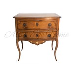 Антикварный комод авторства итальянских мастеров выполнен из ореха насыщенного коньячного оттенка с красивой природной текстурой. По стилистической принадлежности комод тяготеет к эстетике неорококо, то проявилось в изогнутой форме фасада и изящных ножках-кабриоль. Комод трактован двумя выдвижными ящиками основного объема, с фигурной линией фасада в форме «арбалет». Ящики украшены металлическими розетками и накладными ключевинами в форме медальона, увенчанного бантом. Сглаженные боковые устои комода переходят в изящные ножки, придающие предмету небывалую легкость и воздушность. Щиток на царге дополнен интарсией светлого дерева. Комод датирован 1950-ми гг.