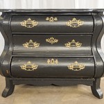 В нашем салоне антиквариата вы можете купить старинный комод авторства нидерландских мастеров, выполненный из дуба, окрашенного в насыщенный черный цвет. Комод имеет оригинальную форму Le serpentine (от фр. извилистый, замысловатый) и тяготеет стилистически к эстетике неорококо, проявившуюся в конструктивном построении и декоративном убранстве. Комод имеет три массивных выдвижных ящика, дополненных изящными металлическими накладными ручками и ключевинами. Фигурный контур столешницы и акцентные ножки комода придают предмету легкую игривость и галантность. Комод массивен, добротен и способен украсить своим аутентичным характером как классический, так и современный интерьер. Антикварный комод из коллекции старинной мебели Alter Ego Home датирован 1910-ми гг.