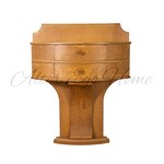 Антикварный консольный столик авторства нидерландских мастеров выполнен из массива дуба богатого медового оттенка с великолепным природным рисунком. По стилистической принадлежности консольный столик тяготеет к эстетике бидермейера, стиля буржуазного искусства, популярного в Европе с 1810-х гг. Термин «бидермеиер» («бравый господин Мейер») как синоним мещанства ввел в обиход немецкий поэт Людвиг Эйхродт, промышлявший сочинением эпиграмм. Для эстетике бидермейера характерны упор на практичности, прочности, доброкачественности, удобстве и целесообразности. В мебели эпохи бидермейера можно обнаружить большую часть современных типов. Мебель впервые становится свободной от архитектурных форм и чужеродного декора. Критерием качественности мебели теперь считаются удобство форм и безукоризненная столярная работа. Антикварный столик из коллекции Alter Ego Home трактован двумя рядами полукруглых выдвижных ящичков с гладким профилированным подстольем. Задний полик оснащен фигурными выемками в верхних углах. Широкая ножка покоится на профилированной базе. Основной художественный акцент предмета сделан на столярном мастерстве в совокупности с роскошной древесиной дуба. Консольный столик датирован 1920-ми гг.