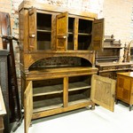 Антикварный буфет авторства французских мастеров выполнен из орехового массива богатого чайного оттенка с градиентом и богатой природной текстурой. По стилистической принадлежности буфет эклектичен, в нем присутствуют ключевые черты стиля бидермейер, стиля буржуазного искусства, популярного в Европе с 1810-х гг. Термин «бидермеиер» («бравый господин Мейер») как синоним мещанства ввел в обиход немецкий поэт Людвиг Эйхродт, промышлявший сочинением эпиграмм. Для эстетике бидермейера характерны упор на практичности, прочности, доброкачественности, удобстве и целесообразности. В мебели эпохи бидермейера можно обнаружить большую часть современных типов. Мебель впервые становится свободной от архитектурных форм и чужеродного декора. Критерием качественности мебели теперь считаются удобство форм и безукоризненная столярная работа. Буфет традиционно выполняет не только функцию хранения посуды, но и является важным репрезентативным элементом достатка и благополучия хозяйского дома. За глухими или застекленными дверцами буфета было принято хранить не обычную глиняную или керамическую посуду, а изысканные сервизы из фарфора. Антикварный буфет выдержан в светлом колорите, подчёркивающем природную красоту орехового массива. Двухчастный объем буфета оснащен рядом глухих закрытых распашных дверец с филенками. Интересно решение центрального объема, решенного полой аркой, придающей предмету оригинальность и воздушный объем. Буфет, выдержанный в духе минимализма, может стать украшением как городского, так и загородного интерьера. Антикварный буфет датируется 1820-ми гг.