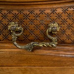 В нашем салоне старинной мебели вы можете купить антикварный шкаф, выполненный французскими мастерами из ореха охристого оттенка. По стилистической принадлежности предмет эклектичен и совмещает неоклассические веяния с декоративным убранством рококо. Шкаф венчает изящный резной карниз с изображением растительного орнамента и композиции из цветов и рокайлей. Предмет оснащен глухой застекленной дверцей с верхней фигурной линией. Внутренний объем шкафа предполагает деление на ряд равновеликих полок. В нижней части предмета расположен выдвижной ящик. Шкаф украшает великолепная резьба в виде трельяжей сетки, которая подчеркивает рисунок древесины. Шкаф датирован 1850-ми гг.