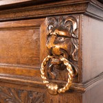 В нашем салоне старинной мебели вы можете купить антикварный полушкаф, изготовленный нидерландскими мастерами из дубового массива насыщенного коньячного оттенка. По стилистической принадлежности полушкаф тяготеет к эстетике неоренессанса, что проявилось в общем художественном решении предмета. Подобные полушкфы выполняли роль сервантов и расставлялись вдоль стен бюргерских домов и выполняли служебную функцию. Полушкаф отличается монументальностью форм и сочетанием горизонтального и вертикального членения. Полушкаф оснащен высоким задним поликом, гладкой прямоугольной столешницей, двумя выдвижными ящиками и массивными распашными дверцами. Вертикальные устои полика и основного объема декорированы ритмичными профилями. Ящики фланкированы резным львиным маскароном искусной работы, держащим металлическое кольцо. Филенки дверец дополнены контрастными вставками арочной формы и резными композициями. Полушкаф покоится на ножках в форме сплюснутого шара. Антикварный полушкаф датирован 1870-ми гг.