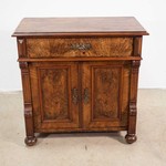 Антикварный полушкаф изготовлен немецкими мастерами из ореха насыщенного каштанового оттенка с великолепным природным рисунком. Предмет имеет четкие структурированные линии и выделяется отточенной симметрией. В стилистическом отношении он близок классической эстетике, при этом отличается свойственной немецким краснодеревцам нативности и видимой простоте. Две распашные филенчатые дверцы скрывают внутренний объем, разделенный горизонтальной полкой. Дверцы и верхний выдвижной ящик декорированы акцентными металлическими накладками. Боковые устои подчеркнуты профилями и массиными точеными ножками в виде сплюснутого шара. Антикварный комод датирован 1880-ми гг.