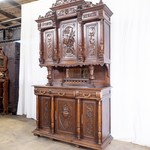 Антикварный буфет авторства французских мастеров изготовлен из массива дуба коньячного оттенка c выраженным фактурным узором. Буфет выполнен в стиле неоренессанс, что проявилось в архитектонической форме и декоре предмета. Стиль неоренессанс появился на рубеже XIX-XX столетий, в рамках стилевого эклектизма. Именно в этот период, во многом благодаря романтической литературе - произведениям П. Мериме, А.Дюма, В. Скотта и др. - возникает повсеместное увлечение эпохой Возрождения. Гуманистическое мировоззрение, торжество земного бытия - типичные черты эпохи Ренессанса, которые вдохновляли мастеров XIX столетия.