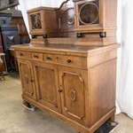 В нашем салоне старинной мебели вы можете купить антикварный сервант авторства немецких мастеров, выполненный из дуба медового оттенка с выраженным фактурным узором. По своему стилистическому направлению предмет эклектичен и вбирает в себя эстетику и черты различных стилевых веяний, популярных на рубеже XIX-XX веков. Монументальный двухъярусный сервант с широкой столешницей дополнен высоким горизонтальным поликом с фигурной линией свода и двумя навесными ящичками с застекленными распашными дверцами. Фасады выдвижных ящиков украшены точеными ручками, выкрашенными в контрастный оттенок. Нижний объем с распашными дверцами позволяет комфортно разместить необходимые бытовые принадлежности. Сервант поражает смелостью художественного решения с обилием резных элементов и гармоничностью сюжетов декоративного оформления. Величественный изысканный сервант сможет выстроить вокруг себя пространство и стать архитектурной доминантой интерьера. Антикварный сервант датируется 1910-ми годами.