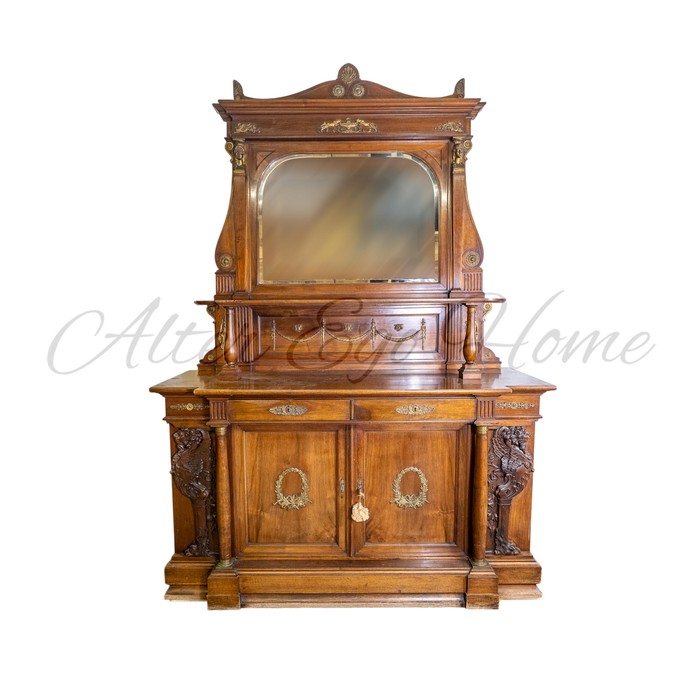 Антикварный сервант выполнен итальянскими мастерами из красного дерева насыщенного чайного оттенка. По стилистической принадлежности сервант тяготеет к эстетике неоклассицизма, что проявилось в симметричной конструкции и художественном оформлении.
