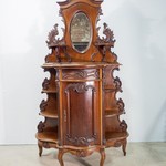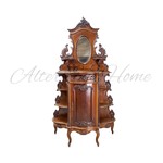 Антикварный шкаф авторства нидерландских мастеров выполнен из ореха богатого оттенка охры с градиентом и декорированный орнаментальной резьбой. По стилистической принадлежности предмет мебели тяготеет к эстетике неорококо, популярному стилю, зародившемуся в Европе в первой половине XIX столетия. Старинный шкаф функционально может использоваться в качестве серванта, буфета или туалетного столика. Предмет представлен изящным вертикальным шкафчиком, оснащенным глухой распашной дверцей и надставленным высоким задним поликом. Задний полик имеет фигурное обрамление из волютообразных завитков и роскошное резное навершие с декоративной композицией и овальным зеркалом. Филенки на дверцах, заднем полике и выдвижном ящичке дополнены контрастными профилями, подчеркивающими тектонику предмета. Шкаф богат резными деталями, которые бесконечно притягивают внимание, и дарят предмету дух романтизма. Антикварный шкаф из коллекции старинной мебели Alter Ego Home датирован 1860-ми гг., находится в хорошем состоянии и готов к использованию в интерьере.