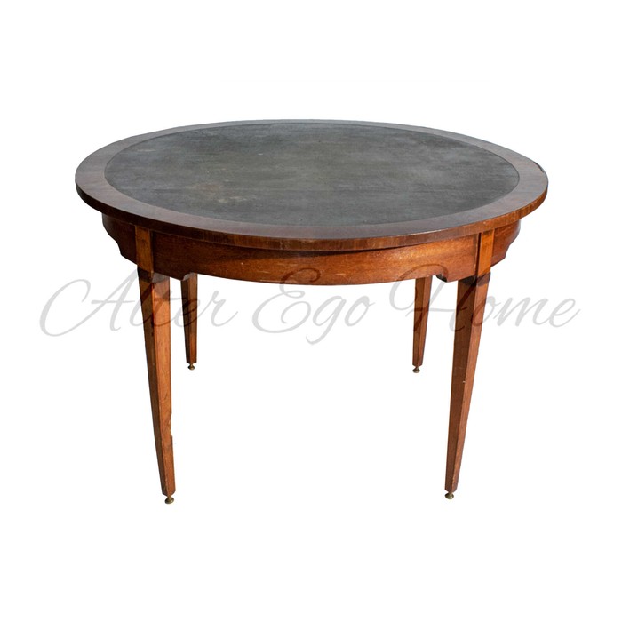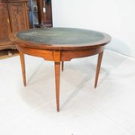Антикварный стол выполнен голландскими мастерами из махагони с выраженным фактурным природным рисунком древесины. По стилистической принадлежности стол тяготеет к эстетике неоклассицизма, что выразилось в строгих, симметричных пропорциях. Стол имеет круглую столешницу, затянутую холстом темно-зеленого цвета с незначительными утратами. Столешница покоится на сужающихся книзу, прямоугольных в сечении ножках, заканчивающихся изящными металлическими каблучками. Стол отличается легкостью и грацией. Стол датирован 1790-ми гг.