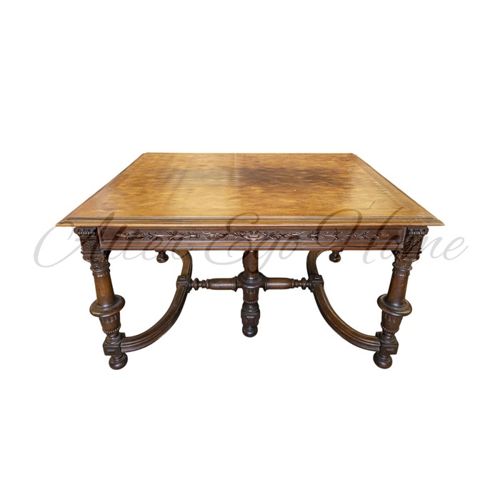 Антикварный стол выполнен французскими мастерами из ореха коньячного оттенка с градиентом. По стилистической принадлежности стол тяготеет к эстетике неоренессанса, получившего широкое распространение в 50-80-е гг. XIX столетия. Именно в этот период, во многом благодаря романтической литературе — произведениям П. Мериме, А. Дюма, В. Скотта и др. — возникает повсеместное увлечение эпохой Возрождения. Неоренессанс является первым стилем, в котором отразилось национальное понимание традиций Ренессанса. Так, во Франции этот стиль получил название стиль Генриха II. Для этого стиля не характерно слепое подражание формам и орнаментике эпохи Возрождения, в нем также могут присутствовать элементы готики, романского и других стилей.
