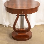 В нашем салоне старинной мебели вы можете купить антикварный столик для рукоделия авторства шведских мастеров, выполненный из махагони насыщенного каштанового оттенка. По стилистической принадлежности столик тяготеет к эстетике классицизма, проявившейся в данном старинном мебельном образце в традиционном для данного стилистического направления мотиве лиры. Во второй половине XIX века занятие рукоделием было важной частью образования девушек. Это занятие было крайне популярно среди аристократок. Каждая мастерица хотела иметь лучший столик для рукоделия, в котором были специальные ящички и ячейки для хранения и систематизации иголок, ниток и т.д. Дамские столики были достаточно легкими для того, чтобы женщина с легкостью могла их перемещать. Днем их приставляли обычно к окну, где было больше света, а вечером к дивану, где при свечах занимались рукоделием. Столик представлен овальной столешницей с выдвижным ящичком. Изящная ножка в виде лиры опирается на устойчивое основание. Гладкие лакированные поверхности столика демонстрируют глубину и выразительность природной текстуры махагони. Техника паркетри, украшающая поверхности столика, демонстрирует мастерство шведских краснодеревцев. Антикварный столик для рукоделия из коллекции старинной мебели Alter Ego Home датирован 1930-ми гг.