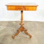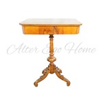 Столик представлен прямоугольной со скошенными углами столешницей с массивным выдвижным ящичком. Балясинообразная ножка, отполированная до блеска, расходится на устойчивое треножье. Гладкие полированные поверхности столика демонстрируют глубину и выразительность природной текстуры ореха. Антикварный столик для рукоделия из коллекции старинной мебели Alter Ego Home датирован 1870-ми гг.
