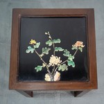 Столик покоится на невысоких прямых ножках. Предмет оснащен квадратной столешницей с профилированными элементами. Главным украшением стола служит композиция, выполненная и составленная из тонированного камня, которую сверху защищает стеклянная столешница. Композиция, размещенная на черном фоне, цветущий куст желтой хризантемы. Она относится к традиционному жанру китайской живописи «цветы и птицы», где изображались растения, птицы, звери либо насекомые. Этот жанр имеет исторические корни, который отображает философские воззрения людей. Хризантема в китайском искусстве изображается часто и символизирует бодрость духа и стойкость перед ненастьями. Цветок хризантемы ассоциируется с осенью, поскольку растение цветет плоть до зимних холодов, когда остальные растения уже отцвели. Также с хризантемой ассоциируется человек в почтенном взрослом возрасте, который отходит от повседневной суеты мира и достигает возвышенного одиночества. Столик датирован 1950-ми гг.