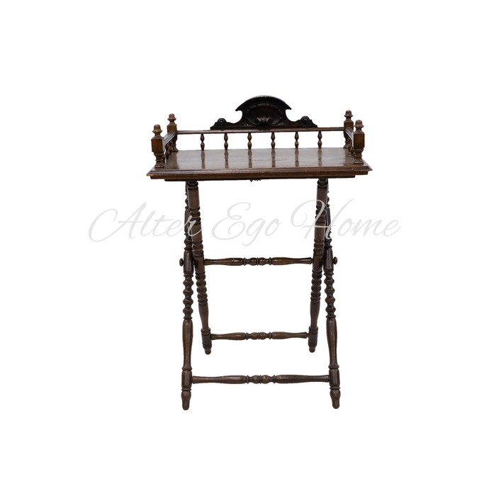 Антикварный столик-поднос авторства нидерландских мастеров выполнен из массива ореха богатого каштанового оттенка и декорирован изящными точеными деталями. По стилистической принадлежности столик-поднос тяготеет к эстетике неоклассицизма. Неоклассицизм возник как реакция на частую смену стилей XIX века, что напрямую отражалось на мебельном убранстве. Желание найти опору в стремительно меняющемся мире, эстетизация прошлого привели к возвращению к классическим пропорциям, симметричным композициям, использованию античных элементов декора. Нидерландские мастера по-своему осмысляли стилевые веяния. Осваивая классицистические формы, они оперировали привычными для них материалами и техническими приемами. Столик-поднос удивляет сочетанием хрупкости и удивительной устойчивости и практичности. Благодаря облегченной конструкции столик мобилен. Главной акцентной деталью столика является оформление изящными точеными деталями: бортики прямоугольной столешницы и удлиненные скрещивающиеся ножки трактованы ритмом отполированных до блеска балясин. Балюстрада на столешнице дополнена фигурным фронтоном, украшенным композицией из акантовых листьев и волют.