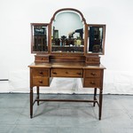 В нашем салоне старинной мебели вы можете купить антикварный туалетный стол авторства нидерландских мастеров, выполненный из красного дерева насыщенного коньячного оттенка с градиентом. По стилистической принадлежности столик тяготеет к переосмысленной мебельными мастерами эстетике бидермейера в соответствии с требованиями начала XX столетия. Туалетный столик сдержан и лаконичен. Верхний ярус трактован композицией из трех зеркал с фацетом и подвижными боковыми створками. Художественность предмету придает фигурный верхний контур центрального зеркала. Нижний ярус оснащен пятью выдвижными ящичками с круглыми точеными ручками искусной работы. Квадратные в сечении ножки с перехватами соединены для устойчивости Н-образной проножной перекладиной. Столешницу отличает природный рисунок древесины, придающий предмету уникальность и глубину. Антикварный туалетный стол датирован 1900-ми гг.