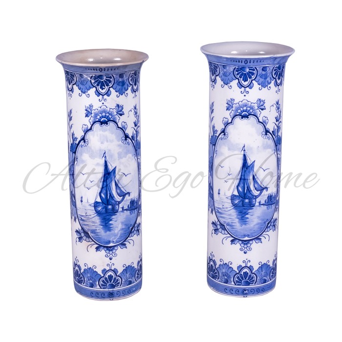 Винтажные парные вазы цилиндрической формы изготовлены из светлого фарфора и украшены синефигурной росписью. Мастерски выполненный морской пейзаж рисует нам кораблик у причала на фоне голубых далей небесных и морских просторов и парящих над ним чаек. Стаффажные фигурки обозначены условно, тогда как кораблик прописан гораздо тщательнее и детальней. Морской пейзаж в картуше занимает небольшое пространство в центральной части тулова. Оставшееся пространство заполнено цветочными букетами и полурозетками. Синие надглазурные клейма: Delft на одной вазе и 22 а другой.