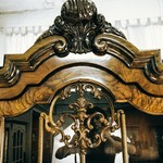Карниз витрины увенчан акротерионом в форме акантового листа. Распашная дверца фланкирована круглыми колоннами, а в ее арке расположен медальон с резным рисунком акантового листа и волютных завитков.
