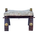 В нашем салоне старинной мебели вы можете купить винтажный табурет, изготовленный нидерландскими мастерами в 1940-х гг. Табурет отличается конструктивной оригинальностью, высоким уровнем исполнения и широким функционалом. Конструкция табурета состоит из козел и подушки для сидения с фигурными боковинами. Металлические медальоны на ножках отсылают к отголоскам римских курульных табуретов, считавшихся прерогативной высшего сословия. Декоративное убранство дополнено металлическими бусинами.