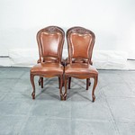 В нашем салоне старинной мебели вы можете купить комплект из четырех винтажных стульев авторства итальянских мастеров из массива ореха насыщенного шоколадного оттенка. По стилистической принадлежности предметы тяготеют к эстетике «второго» рококо, популярного неостиля второй половины XIX столетия. Подобный тип стульев был очень популярен в быту второй половины XIX - начала XX столетия. Будучи лёгкими и мобильными, зачастую подобные стулья расставлялись вдоль стен на балах. Стулья трактованы глухой спинкой-кабриоль в форме скрипки, переходящей на фигурных устоях в пышное трапециевидное сиденье. Щиток спинки и сиденье затянуты кожей насыщенного чайного оттенка. Линия царги решена в форме арбалета и переходит в фигурные ножки-кабриоль на высоких каблучках. Винтажные стулья из коллекции старинной мебели Alter Ego Home датированы 1960-ми гг.