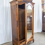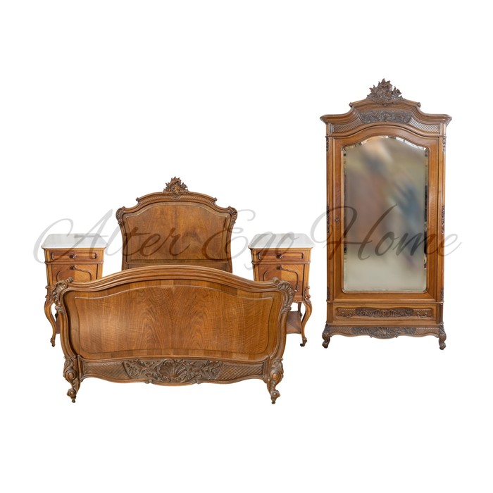Комплект антикварной мебели для спальни авторства французских мастеров выполнен из ореха коньячного оттенка. Комплект состоит из кровати, шкафа и двух прикроватных тумб. По своему стилистическому направлению комплект тяготеет к эстетике неорококо и стилю Людовика XV, что выражается в изогнутых линиях и камерных формах предметов.