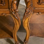 Кровать имеет фигурные профилированные контуры. Лаконичное изголовье венчает разной рокайль с растительными мотивами. Изножье также украшают по краям рокайли, которые элегантно повторяют формы кровати, а внизу на фоне трельяжных решеток располагается изображение раковины, дополненное цветочными узорами. Кровать покоится на невысоких изогнутых ножках-кабриоль, внизу дополненных колесиками. Предмет создает впечатление величественности и пышности. Прикроватные тумбы возникают в эпоху правления Людовика XV, когда начинает прослеживаться тенденция к интимизации личных покоев, а Большой стиль Короля-солнце после периода Регентства становится менее помпезным. Тумбы имеют прямоугольные столешницы белого мрамора. Выдвижной ящик и распашная дверца делают тумбы предельно функциональным, а накладная резьба придает предметам галантный дух. Изящные тумбы украсят собой как классический, так и современный интерьер. Шкаф венчает изящный резной карниз с изображением растительного орнамента и композиции из цветов и рокайлей. Предмет оснащен глухой застекленной дверцей с верхней фигурной линией. Внутренний объем шкафа предполагает деление на ряд равновеликих полок. В нижней части предмета расположен выдвижной ящик. Шкаф украшает великолепная резьба в виде трельяжей сетки, которая подчеркивает рисунок древесины.