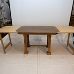 Комплект мебели для гостиной, состоящий из стола, четырех стульев и двух кресел, авторства бельгийских мастеров выполнен из светлого дуба с красивым природным рисунком. Стилистически комплект являются продуктом творческого переосмысления бельгийских мастеров господствующего стиля модерн и сохранившихся проявлений историзма. Начало XX века в мебельном искусстве интересно яркими местными национальными школами. Бельгия являлась очагом нового движения в области прикладного искусства. Предметы отвечают основным тенденциям в мебельном формообразовании начала столетия: утилитарная конструкция, минимум декора, при его наличии - полное подчинение конструктивному решению. Орнаментальное, эстетическое начало, согласно бельгийскому художнику и выразителю новых тенденций в искусстве Ван де Велде, должно быть заложено в самой форме предмета. Стулья трактованы глухой квадратной спинкой с зубчатой линией свода. Боковые прямоугольные в сечении устои в верхней части завершаются завитком и переходят в задние ножки. Мягкое трапециевидное сиденье и центральная часть спинки затянуты тканью золотистого оттенка. Передние ножки соединены с задними плоскими устойчивыми коньками. Кресла полностью повторяют конструкцию стульев и дополнены плоскими гладкими локотниками. Стол решен в виде прямоугольной столешницы со скошенными углами и массивного подстилая в виде двух глухих оснований, соединённых гладкой проножкой. Основания имеют филёнки, украшенные искусной резьбой в виде розеки, вписанной в прямоугольник. Боковые основания декорированы барельефными фигурами рыцарей в латах. Предметы датированы первой половиной XX столетия.