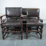 В нашем салоне старинной мебели вы можете купить комплект, состоящий из семи винтажных стульев и одного кресла, авторства английских краснодеревцев. Предметы гарнитура выполнены из дуба глубокого кофейного оттенка и дополнены точеными деталями. По стилистической принадлежности предметы тяготеют к эстетике необарокко, что проявилось плоской прямоугольной спинке и точеных деталях. Предметы имеют мягкую спинку, и сиденья, затянутые кожей в тон древесине. Проножная перекладина выполнена в виде ритмичных бус. Ряд обойных гвоздей с декоративными шляпками подчеркивает тектонику предметов. Несмотря на необарочную стилистику и использование массива дуб, предметы отличаются легкостью, изящностью и элегантностью. Комплект мебели для сиденья прекрасно дополнит обстановку гостиной и столовой. Атмосферный комплект из коллекции старинной мебели Alter Ego Home датирован 1960-ми гг.