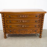 Антикварный комод оснащен четырьмя выдвижными ящиками, украшенными полихромной флоральной росписью. Ящики фланкированы точеными боковыми устоями в виде массивного жгута, переходящими в устойчивые балясинообразные ножки. Комод отличается целостностью, оригинальной художественной задумкой и изяществом исполнения. А рельефная резьба на нижнем выдвижном ящике придает предмету особую нарядность и национальный задор.