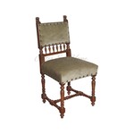 Антикварные мягкие стулья второй половины XIX века. Комплект из 6 стульев был изготовлен из древесины дуба в Бельгии в 80-х годах позапрошлого века. Сидение и спинка стула обтянуты нежным, ворсистым бархатом серо-зеленого цвета и оформлены декоративными гвоздиками. Спинку стульев венчают две небольшие львиные головы.