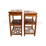 В нашем салоне старинной мебели вы можете купить пару антикварных столиков авторства китайских мастеров, выполненных из тика великолепного оттенка охры. Парные столики являются отражением национального творчества китайских краснодеревщиков и имеют характерные формы и элементы. Подобный тип столиков мог использоваться в качестве кофейного, сервировочного или вспомогательного. Столики оснащены квадратной столешницей, покоящейся на высоких квадратных в сечении ножках. Две проножные полочки служат укреплению конструкции и дополнительным декоративным элементом. Столики датированы 1940-ми гг.
