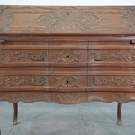 Антикварный секретер выполнен во Франции из дуба темно-кофейного оттенка. По стилистической принадлежности секретер тяготеет к эстетике неорококо, о чем свидетельствуют форма и декоративное решение предмета. Секретер - мебельная форма, появившаяся в Европе в эпоху Ренессанса. Исторически секретер считался прерогативой аристократов, символом высокого общественного положения. Он предназначался для хранения бумаг, а откидная крышка позволяла бегло ответить на корреспонденцию. Секретер имеет откидную доску - столешницу. Внутренний объем разделен на ячейки для хранения бумаг и письменных принадлежностей. В нижней части секретер дополнен двумя глухими выдвижными ящиками с фигурными металлическими ручками. Неповторимый художественный облик секретеру придает рельефная резьба рокайльного характера, деликатно украшающая откидную крышку и выдвижные ящики. Особую динамику предмету придает фигурный абрис лицевой поверхности. Секретер имеет ножки-кабриоль. Секретер датируется 1890-ми гг.