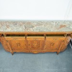 В нашем салоне антикварной мебели вы можете купить винтажный сервант авторства итальянских мастеров, фанерованный ценнейшим палисандровым деревом насыщенного медового оттенка с великолепной природной текстурой. По стилистической принадлежности сервант тяготеет к эстетике неорококо, проявившейся в изогнутых ножках и декоративном убранстве. Сервант оснащен пятью глухими распашными дверцами, декорированными деревянными профилями, придающими дополнительную архитектонику предмету. Боковины имеют полуциркульный изгиб. Фигурная линия царги плавно переходит в изогнутые ножки-кабриоль на высоких каблучках. Вся поверхность серванта покрыта маркетри и наборными композициями. Мягкие переливы тональности фанеровки придают предмету глубину и богатство. Сервант из коллекции старинной мебели Alter Ego Home датирован 1950-ми гг.