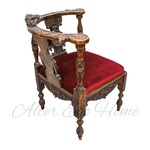 Приставное угловое кресло, несущее в себе черты ренессанса, изящно украшено резьбой по дереву. Листья аканта пущены по полукруглой спинке и поддерживающим ее столбикам. Середина спинки кресла увенчана рельефным изображением головы купидона в окружении плодов груш. Художественный язык орнамента может восприниматься как некое поэтическое иносказание. В образной системе, где предметы имеют второй, дополнительный смысл, купидон и фрукты, которые ассоциируются с греческой богиней Афродитой, трактуются как символы любви и сладострастия. Европейская культура во многом опиралась на античные символы.