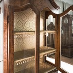 Внутренняя часть витрины обита вышитым гранатовым узором золотистого цвета. Полочки дополнены позументом с переплетенной бахромой. По внутреннему периметру стеклянных вставок пущен золотистый витой шнур.