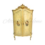 В нашем салоне старинной мебели вы можете купить антикварный платяной шкаф авторства итальянских мастеров, выполненный из древесины, сплошт покрытой красочным слоем. По стилистической принадлежности шкаф тяготеет к стилистике неорококо, что проявилось в общей архитектонике предмета и декоративном решении. Исторически шкафы подобной формы могли использовались как часть приданного невесты. Они наполнялись нарядами, украшениями, домашним текстилем, куханной утварью и пр. Шкаф имеет фигурный фронтон, увенчанный сквозной резной золоченой композицией в виде акантовых листьев. Шкаф оснащен двумя глухими распашными дверцами, повторяющими в верхней части форму фронтона, внутренний оснащен крючками для одежды.. Царга - фигурная, переходит в невысокие ножки-кабриоль. Главной акцентной деталью предмета являются живописные вставки, стилизованные под французскую технику Vernis Martin. Техника была названа Vernis Martin в честь братьев Мартен, которые были известны в 1702-1765 гг. во Франции. Они впервые модифицировали модную в конце XVII столетия китайскую технологию лакировки мебели. Французская техника работы с лаком была разработана в 1730 году. А в 1744 году братья получили патент на украшение деревянных изделий (мебель, панно, мебельные вставки) лаковым покрытием с насыщенным глянцевым блеском в пастельных оттенках. Комод прекрасно впишется как в современный, так и классический интерьер. Шкаф датирован половиной XX в.