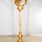 В нашем салоне антиквариата можно купить напольную вешалку, выполненную из резного дерева, покрытого глухим красочным слоем с элементами золочения. По стилистической приналежности вешалка тяготеет к эстетике неорококо, проявившейя в изобильном декоративном убранстве и рокайльных мотивах. Вешалка трактована вертикальной профилированной стойкой, расходящейся в верхней части на три волютообразных завитка и богатое навершие в виде цветочной композиции. Акцентно выделенные позолотой элементы, придают предмету глубину и объемность. Напольная вешалка может стать акцентным предметом интерьера и внести в него дух романтизма. Вешалк датирована 1960-ми гг.