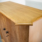 В нашем салоне старинной мебели вы можете купить винтажный шкафчик авторства бельгийских мастеров, выполненный из массива дуба богатого медового оттенка с красивой природной текстурой. По стилистической принадлежности полушкаф эклектичен и минималистичен. Полушкаф оснащён двумя глухими распашными дверцами с круглыми ручками контрастного цвета. Полушкаф покоится на ножках-«коньках», соединенных глухой проножкой. Большие гладкие поверхности демонстрируют великолепный узор дубового массива. Полушкаф датирован 1940-ми гг.